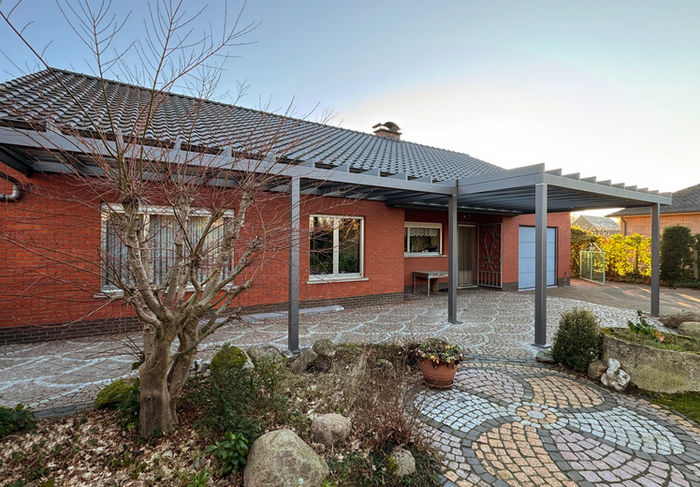 Het oudere afdak werd afgebroken en vervangen door een nieuwe, knappe overkapping met glazen dak.